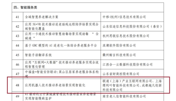 2026年1月21日,中华人民共和国工业和信息化部官方网站公示了“2025年数字适老助残产品和服务典型案例”,联通(上海)产业互联网有限公司联合上海傅利叶智能科技有限公司、成都越凡创新科技有限公司申报的“应用机器人技术推动养老场景实现智能化”案例成功入选。